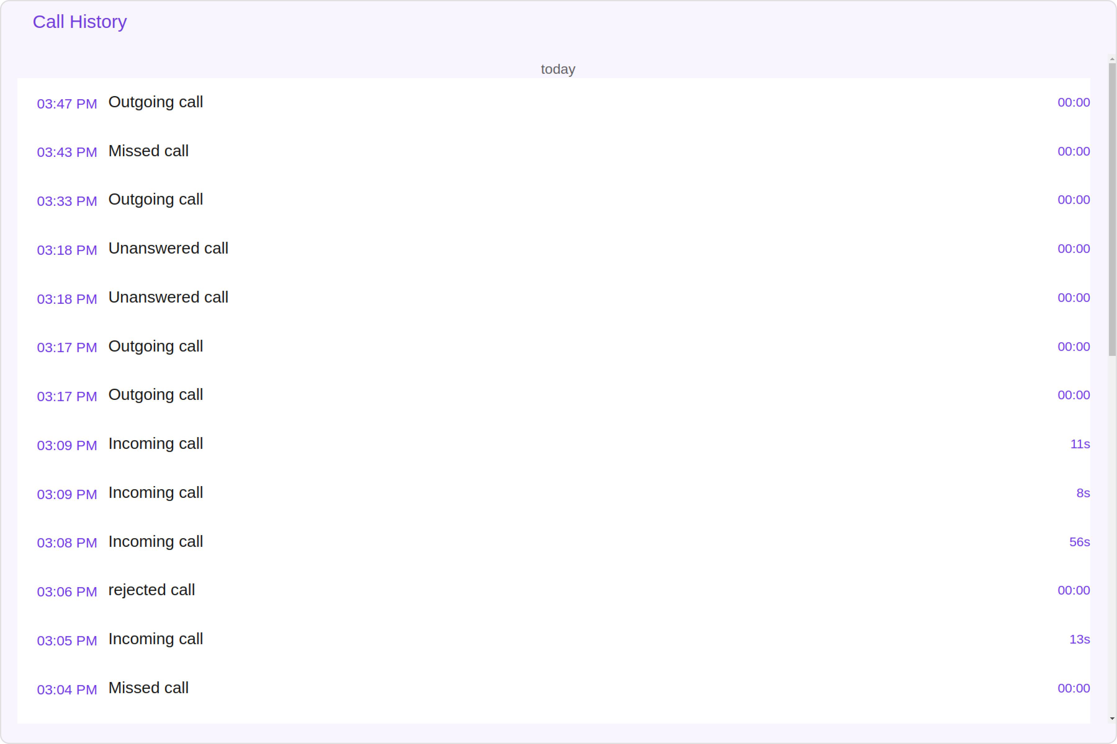 To customize the appearance, you can assign a CallLogHistoryStyle object to the Call Log History component. Example In this example, we are employing the callLogHistoryStyle.
