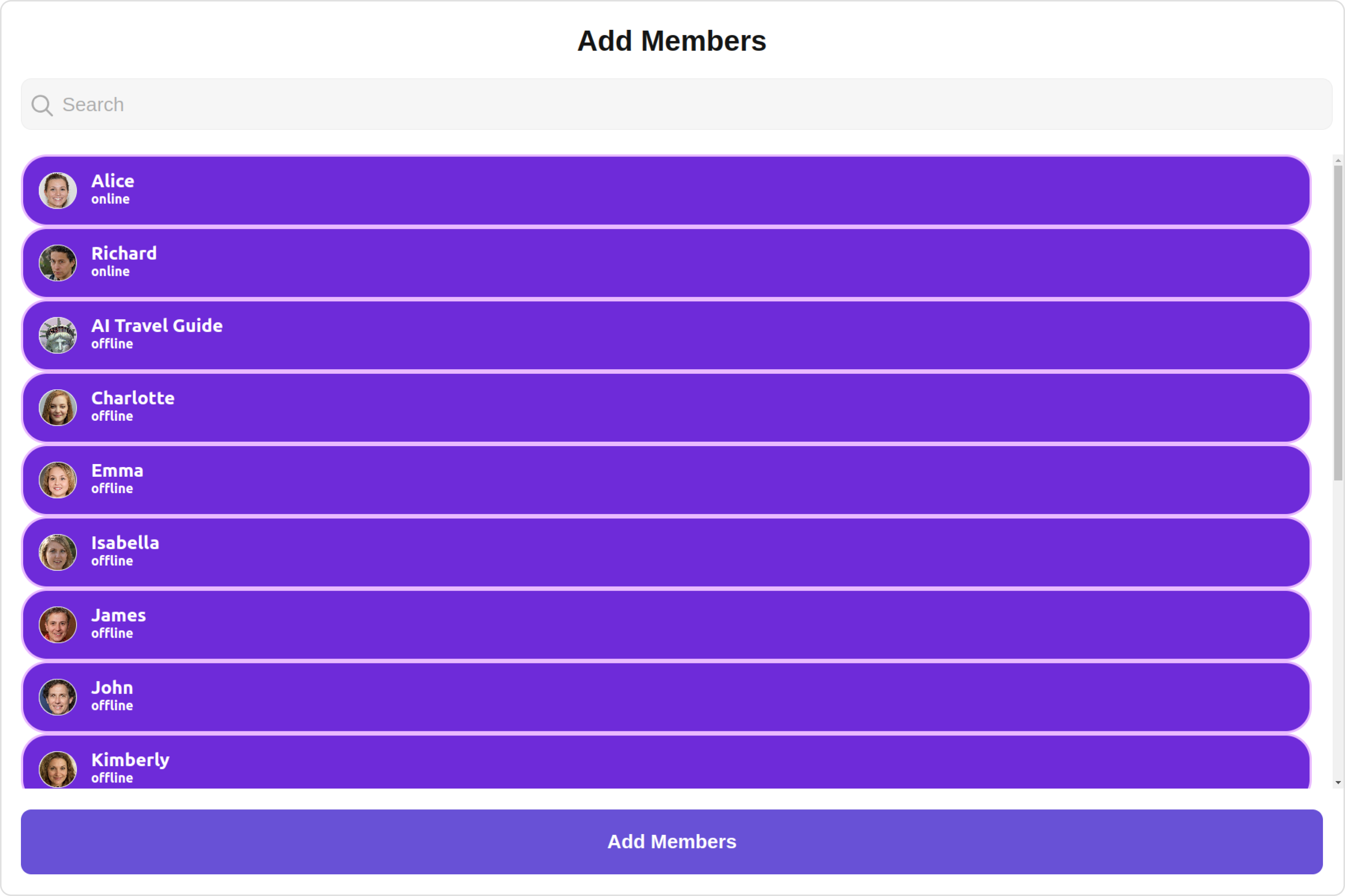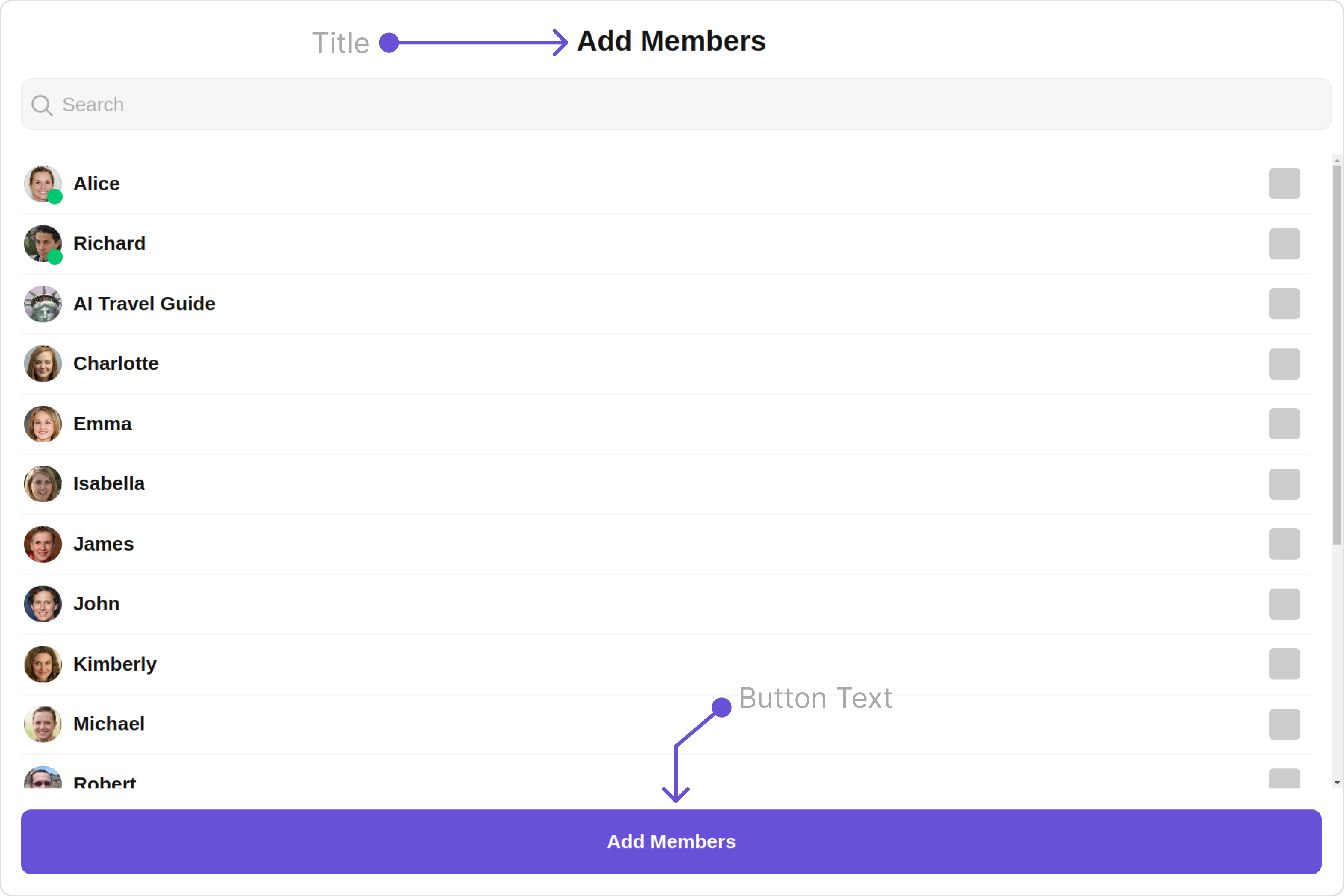 To fit your app’s design requirements, you can customize the appearance of the Add Members component. We provide exposed methods that allow you to modify the experience and behavior according to your specific needs.Style