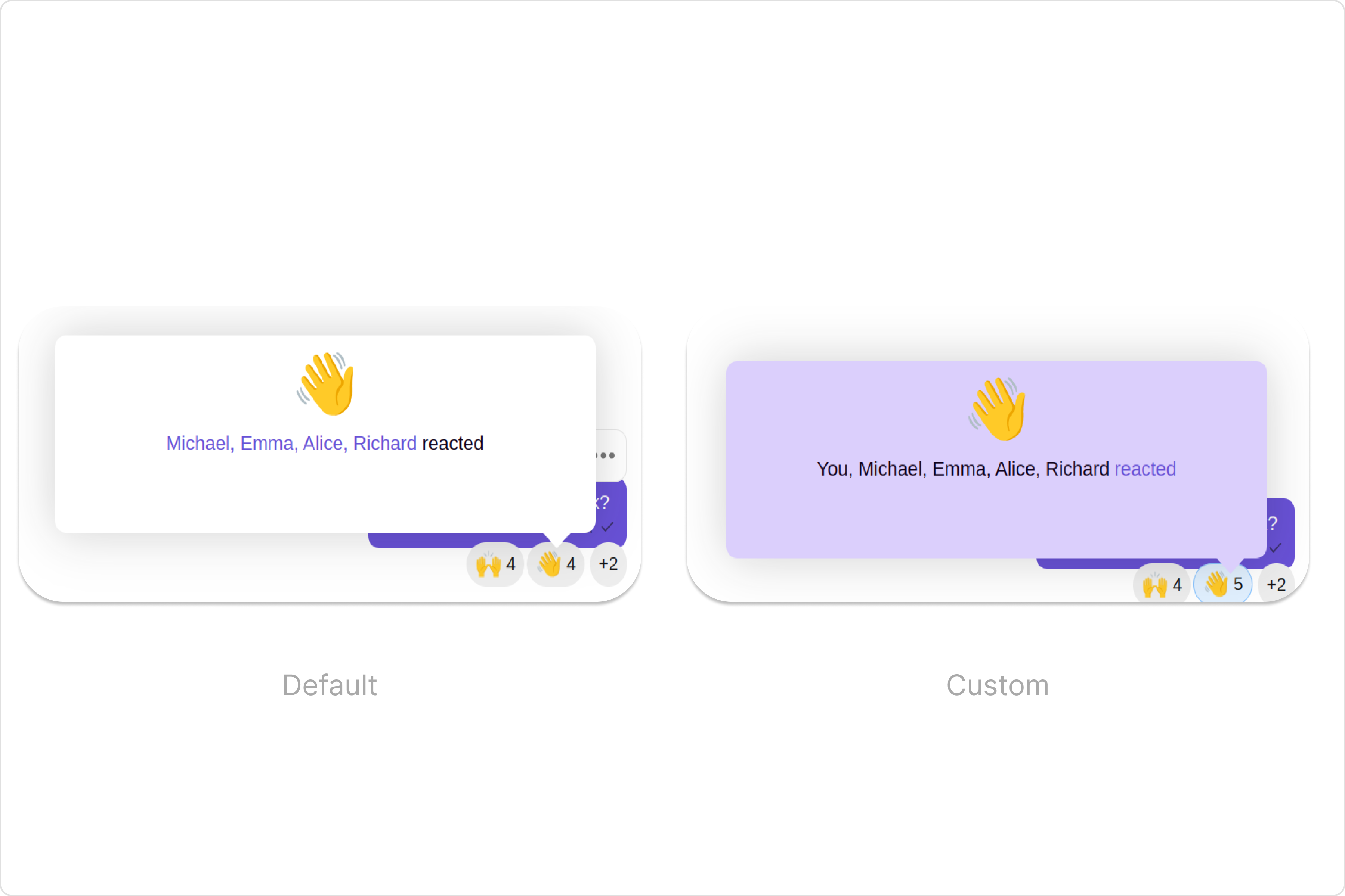 To fit your app’s design requirements, you can customize the appearance of the Reaction Info component. We provide exposed methods that allow you to modify the experience and behavior according to your specific needs.Style